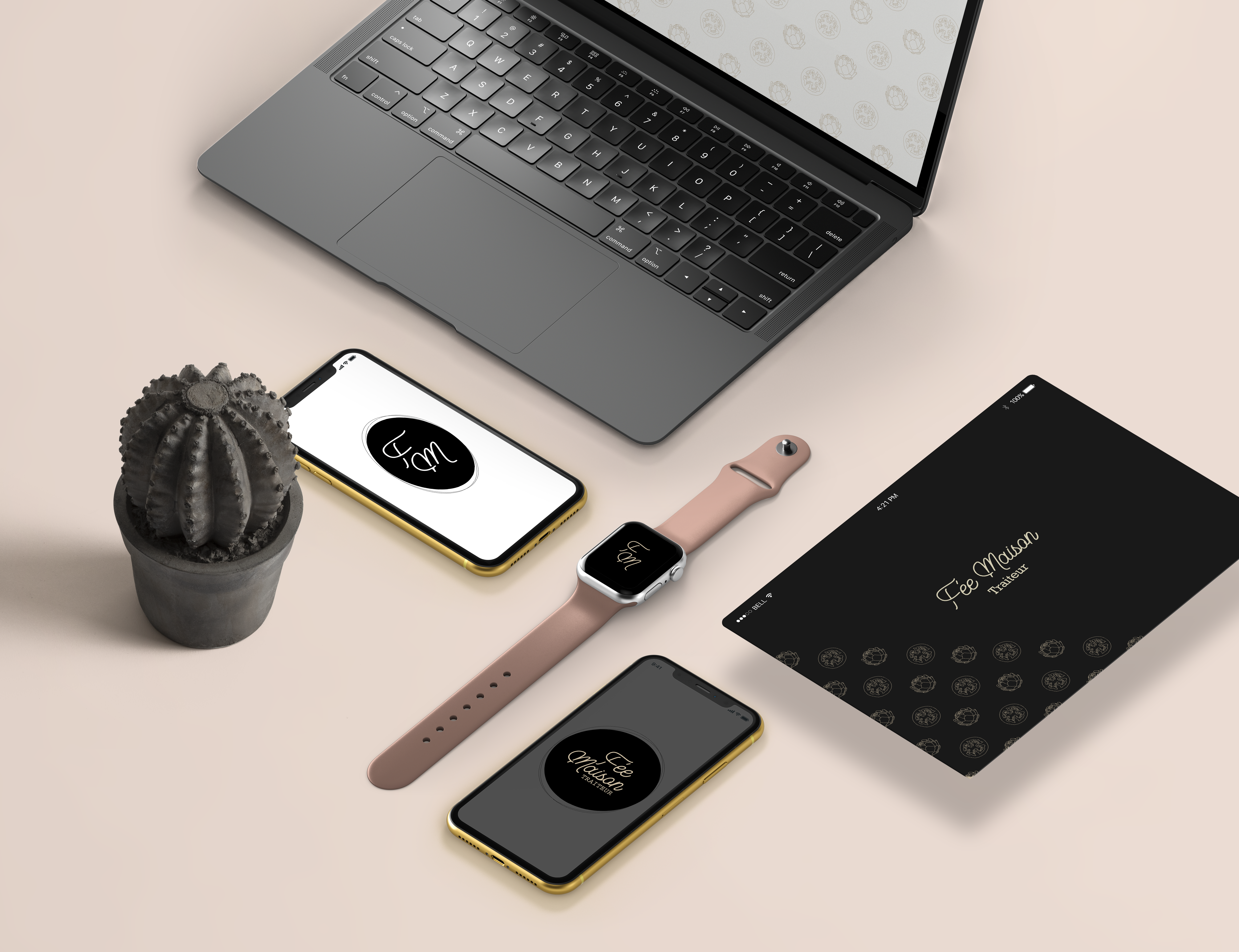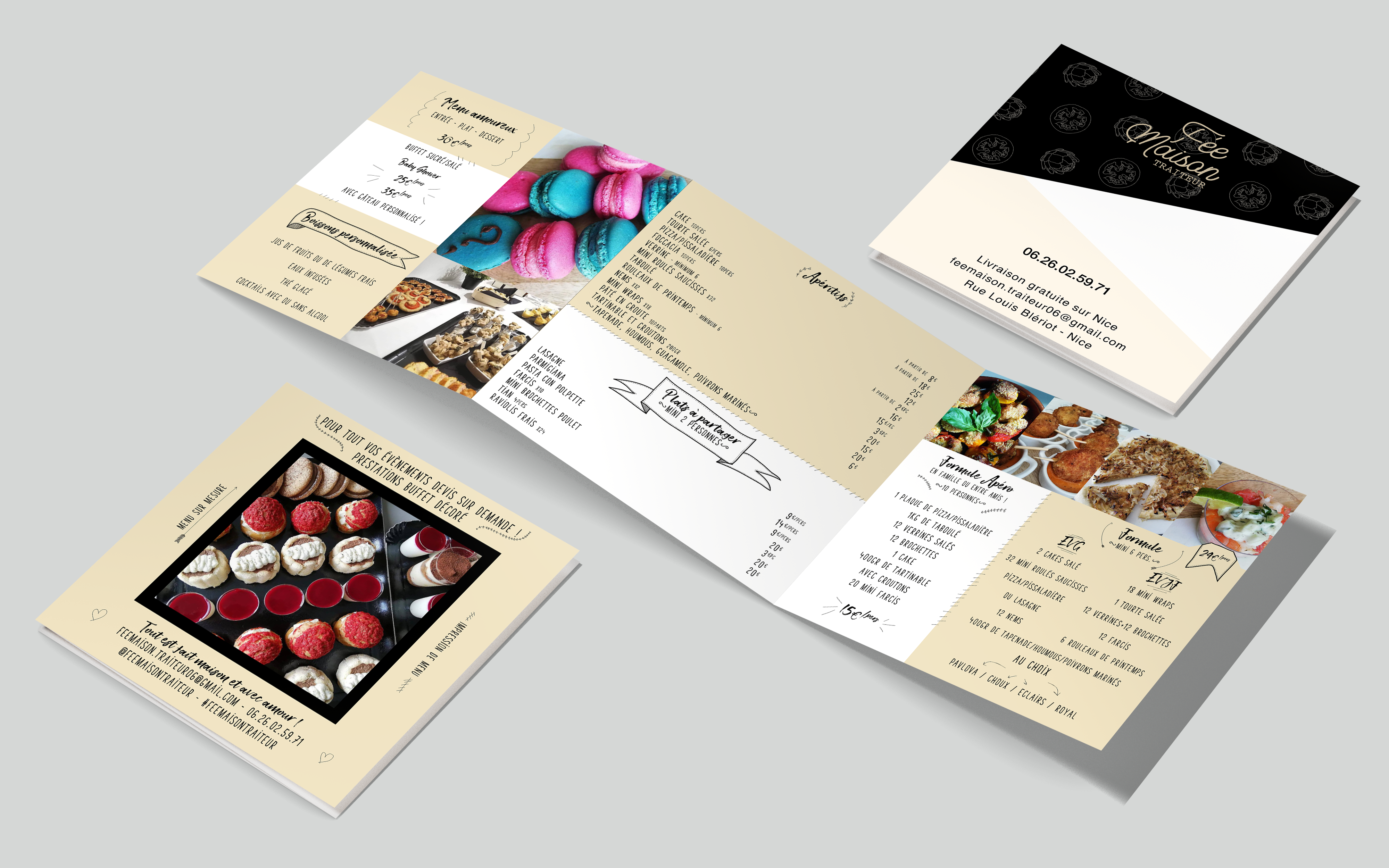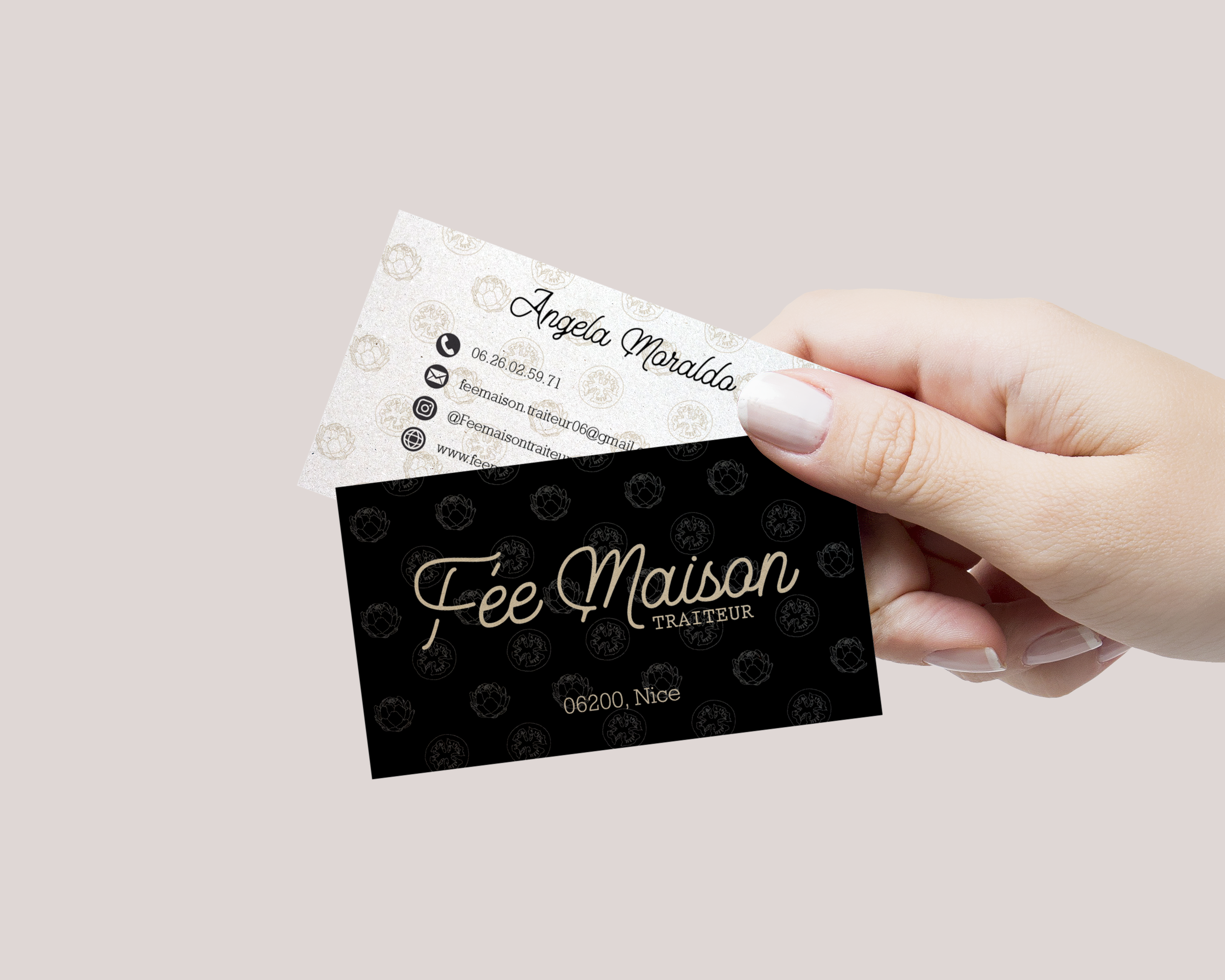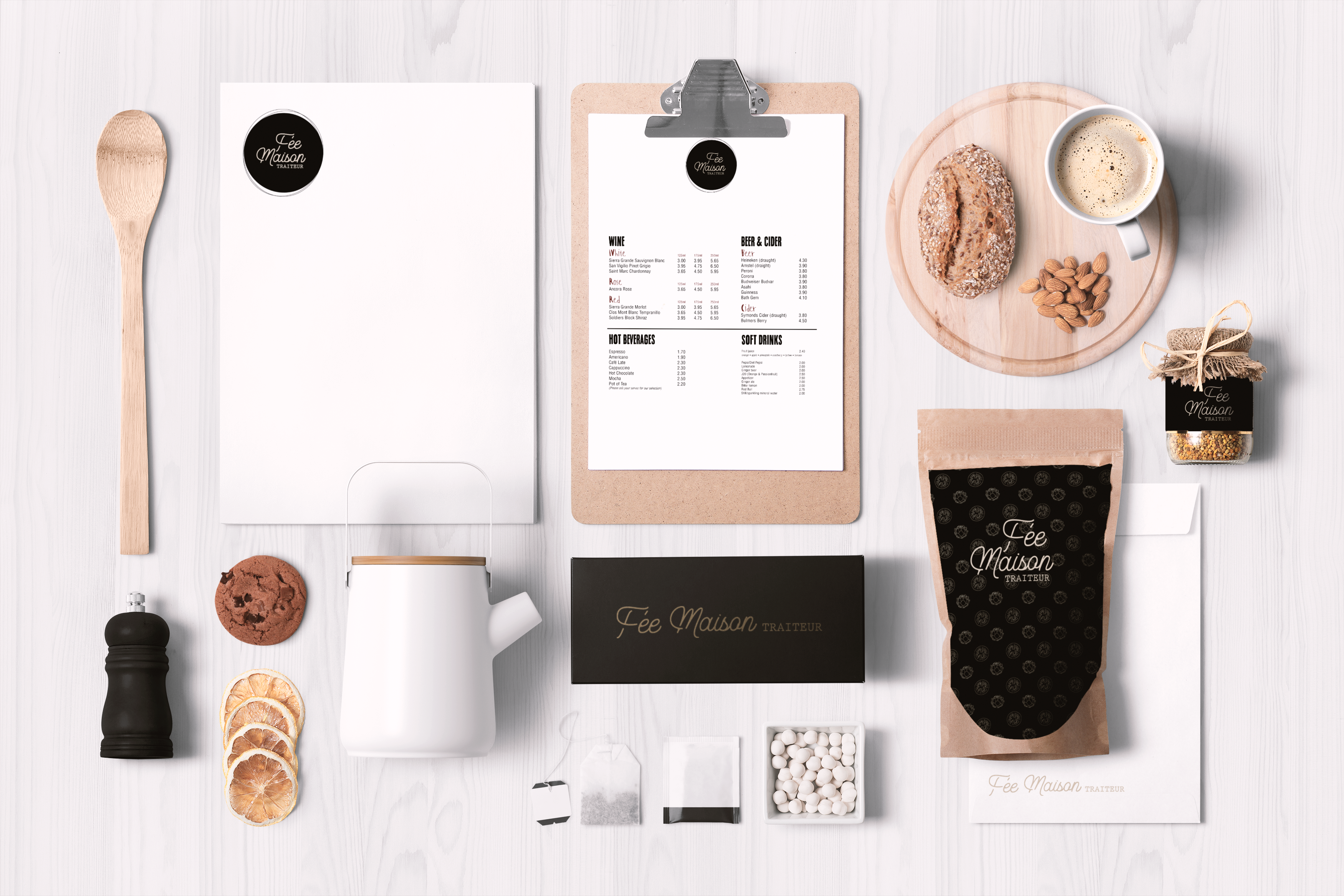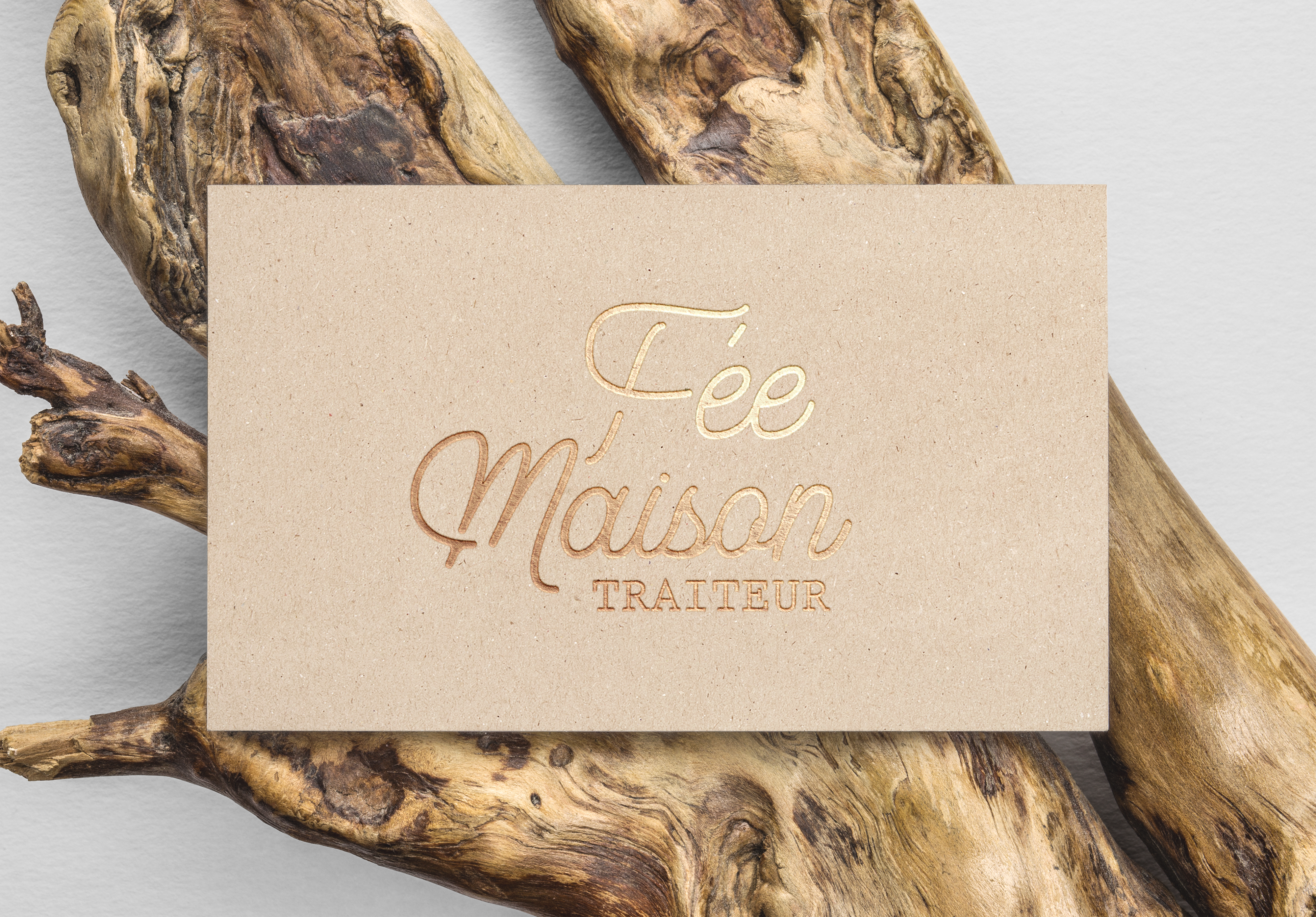 Fée Maison Traiteur allie la grande qualité et le familial. Pour l’identité visuelle il était nécessaire de faire ressortir le côté haut de gamme et le côté chaleureux. Ce mélange se retrouve dans les couleurs, les matières et les choix typographiques.
