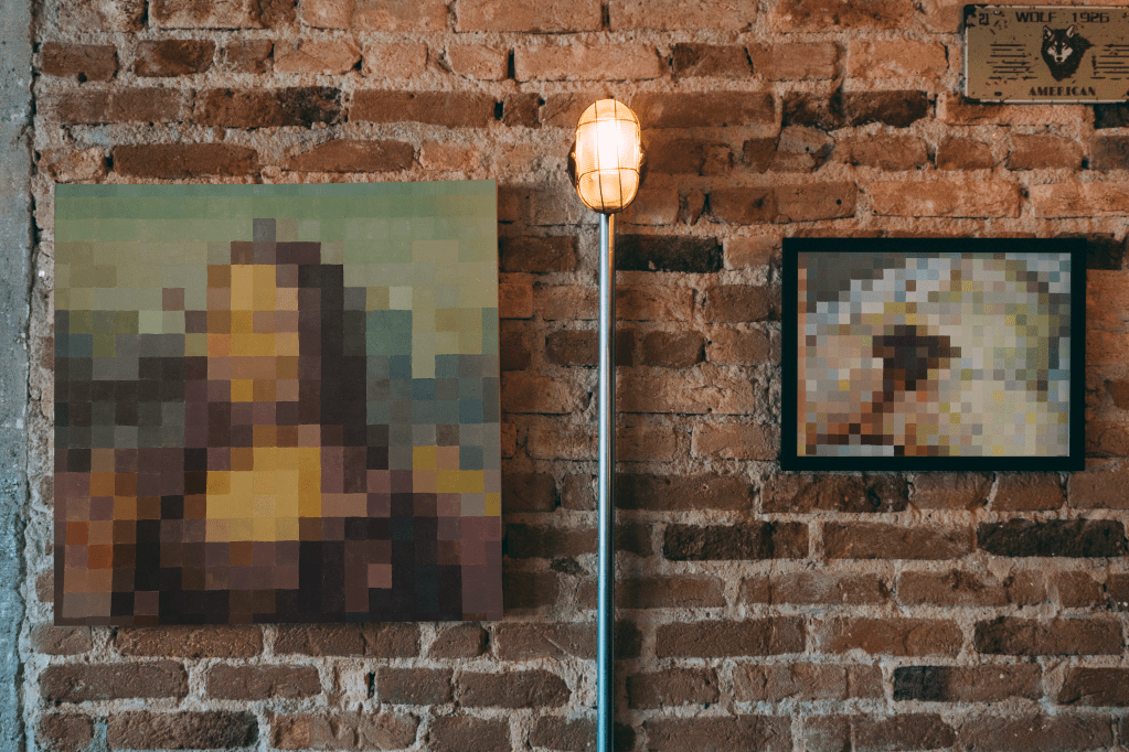«Pixels» est une réflexion sur la fabrication de nos images à travers le temps ainsi qu’un jeu d’optique utilisant les outils modernes. Lorsque les toiles sont observées à travers un appareil photo ou un smartphone, l’oeuvre apparait plus nettement comme l’originale, ainsi qu’en jouant avec la lumière où en la plaçant derrière certains matériaux. Il est amusant de constater à quel point malgré peu d’indice, ou une mauvaise visibilité, nous reconnaissons de grandes oeuvres tellement elles sont imprimés (in)consciemment dans notre esprit.